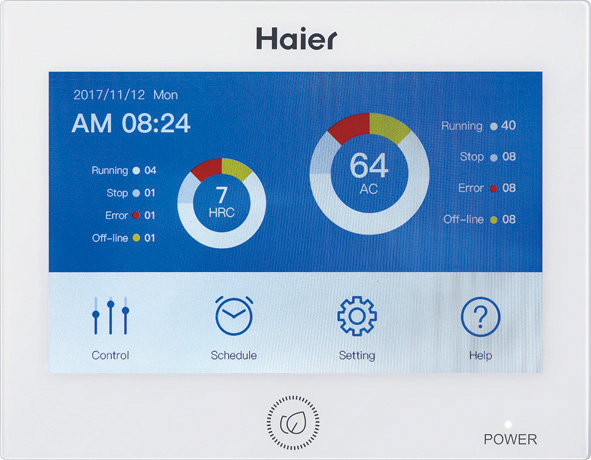 Contrôleur central optionnel avec écran tactile couleur rétro-éclairé de 5 pouces. Il dispose d'une minuterie hebdomadaire intégrée ainsi que la possibilité de personnaliser et d'attribuer de noms aux unités ou aux groupes, d'afficher les alarmes et d'avoir une sortie MODBUS en standard. La commande est conçue pour connecter jusqu'à 64 unités intérieures et a la capacité de contrôler simultanément les unités MRV et Split Supermatch, ou les unités résidentielles.